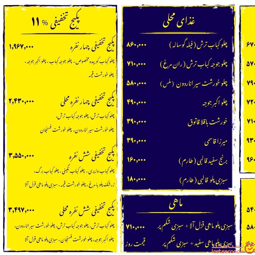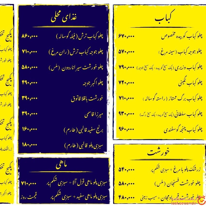 چلو کباب کوبیده، چلو کباب ترش، چلو جوجه ترش، چلو کباب چنجه ،چلو خورشت فسنجان و شامی گوشت هم سفارش دادیم.